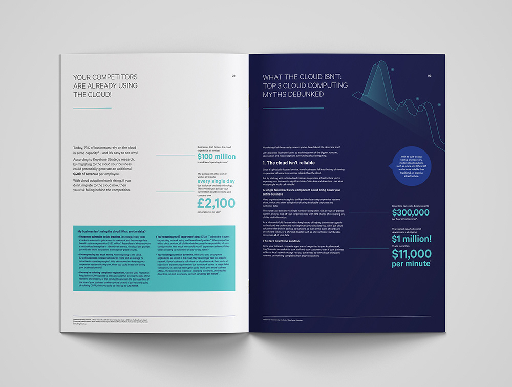 This brochure for cloud computing experts Systems Assurance explains to IT managers why using cloud services makes business sense. I created a look and feel that uses illustration rather than the usual tired stock photography to present a fresh take on IT solutions.